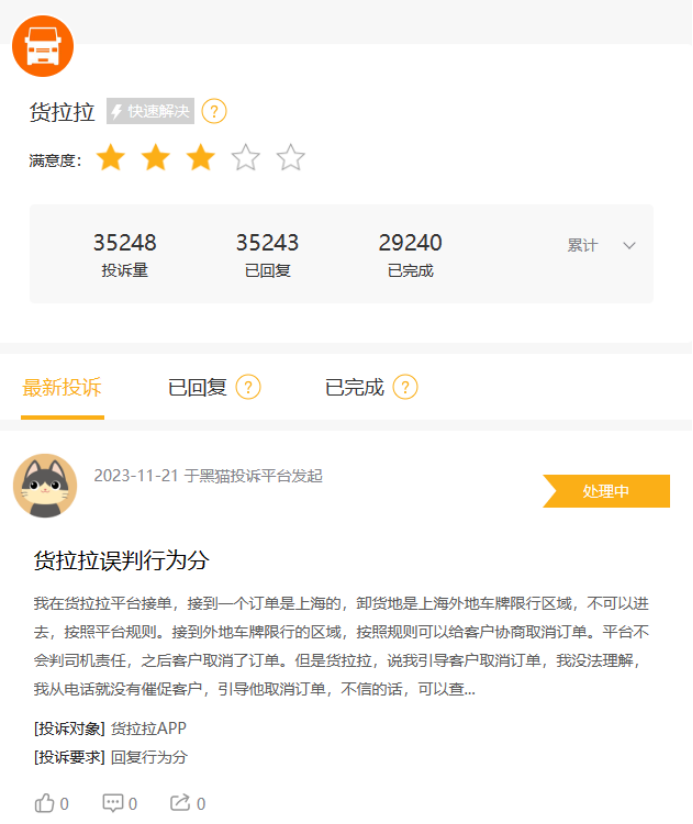 總體上,在黑貓投訴平台上,貨拉拉的投訴量高達3.5萬多條,涉及到的司機權益及消費者訴求是重中之重。