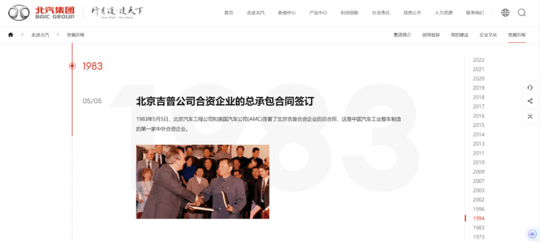 1983年,作為改革開放的先鋒隊,北京汽車製造廠和美國第四大汽車廠AMC(美國汽車公司)共同組建了中國第一家合營車企——北汽吉普,開啓了中外合資辦廠的先例。而彼時的上汽還正處於和大眾的談判階段。