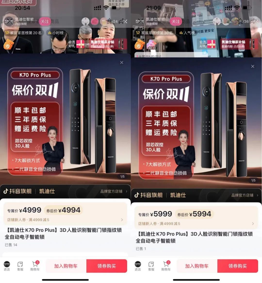 凱迪仕在抖音直播間也是出現誘導用户先拍後退的行為,以“搶免費體驗官”的噱頭讓用户下單,主播不斷告知20單即可免1單,鼓勵未搶中免單用户退單,大多情況下都導致了剩餘19位用户都退單了,實際僅成交1單。如下圖所示,20:54分直播間某款單品已售14套,但到21:09分該單品的已售套數為1套。這種5999的高價大單,成交了10000多單,為的是高價的訂單能夠增加更高的成交額,但實際上絕大部分用户都進行了退單。且該直播間用户都發彈幕稱:門鎖不要錢!在雙十一期間凱迪仕多個直播間均以“搶免單”為噱頭,我們很難判斷凱迪仕是為了吸引曝光流量?還是為了更亮眼的數據。