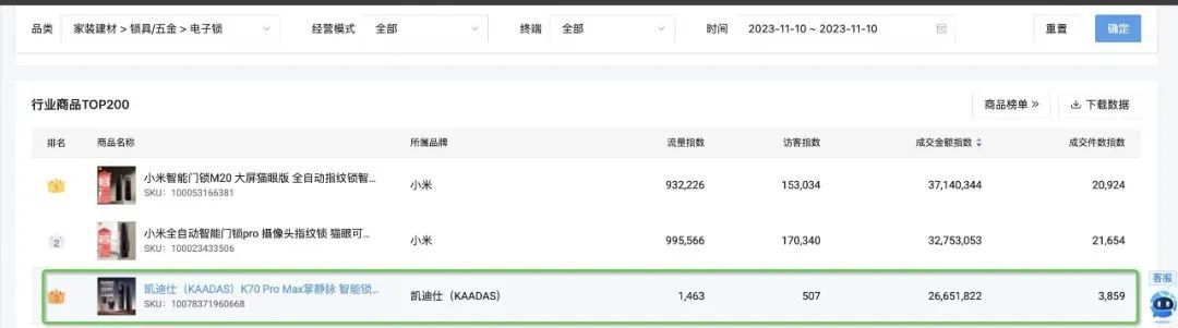 如圖一所示,天貓平台10月31日凱迪仕某款產品支付買家數974人,交易金額達1900萬,客單價為19507元。從圖二可以看出,11月3日凱迪仕某款產品支付買家數為409人,支付件數為1905件,客單價為21834元,意味着每位買家都支付了多件智能鎖產品;而圖三顯示凱迪仕在日常的歷史銷售數據上客單價為1200-3000元,而奧維雲網發佈的關於智能鎖行業23年1-9月份的市場均價為1129元。智能鎖也因其品類的特殊性,絕大多數家庭通常只買1套,不難看出,此次雙十一期間凱迪仕的銷售數據存在明顯異常。