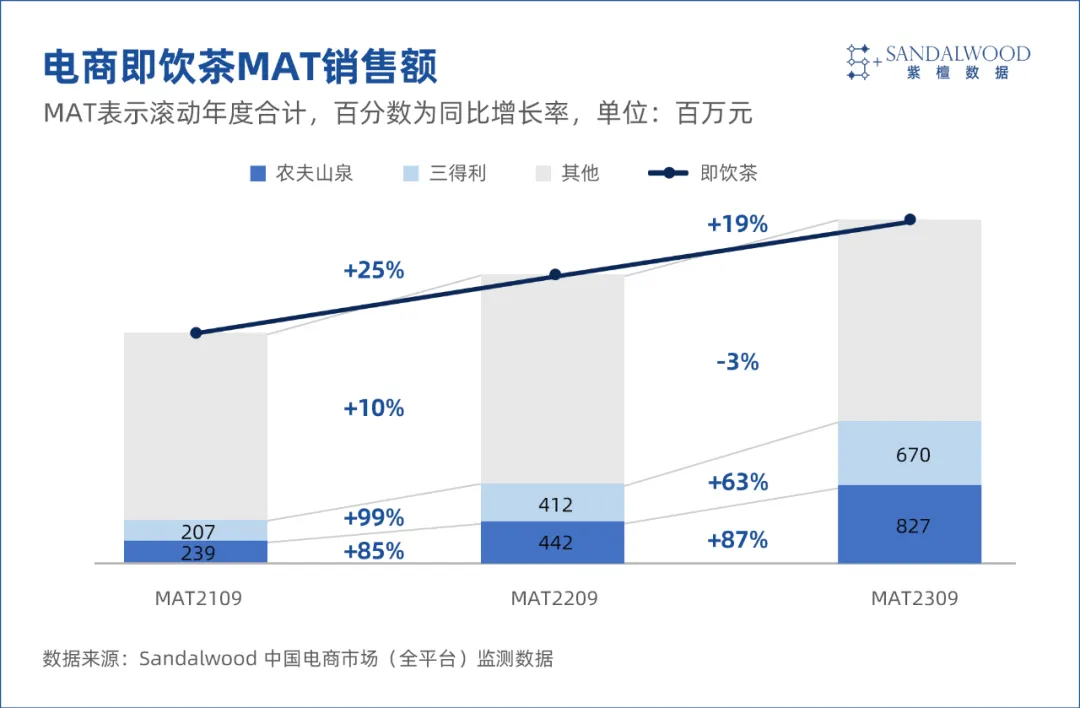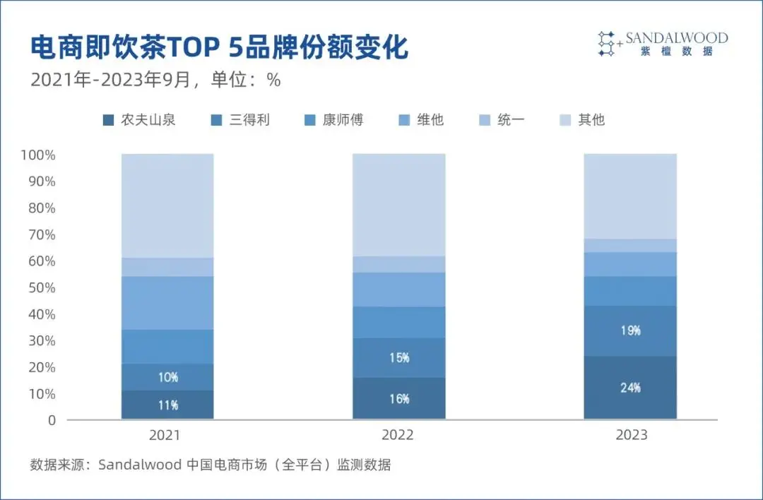 根據Sandalwood中國電商監測數據,截至2023年第三季度的過去12個月裏,農夫山泉和三得利的電商市場份額合計超過40%,是自2021年以來唯二份額持續增長的頭部品牌。