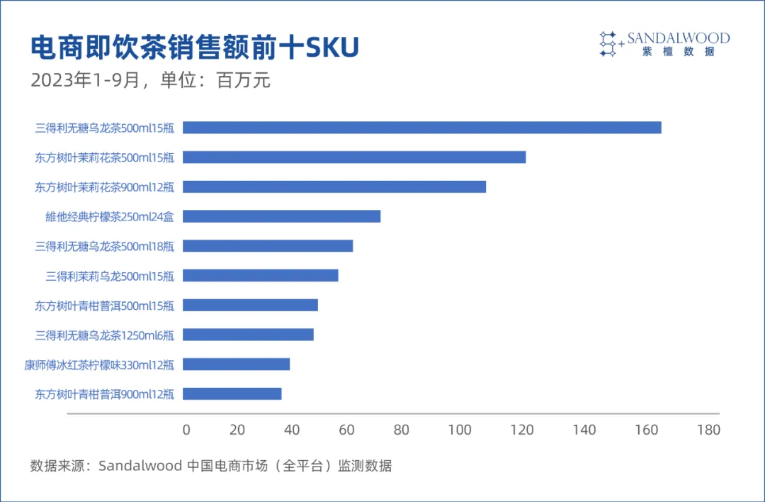 根據Sandalwood中國電商監測數據,電商渠道銷售額前十的產品中有8款無糖茶來自農夫山泉和三得利,出現三支億元級SKU,凸顯了在健康訴求驅動下消費者主動減少糖分攝入的偏好。