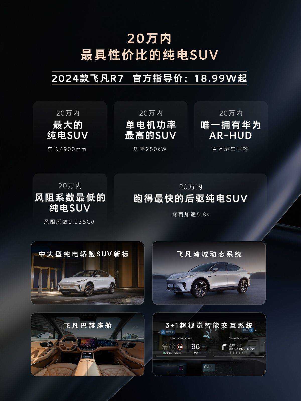 總的來看,2024款飛凡R7價格、價值“雙雙錯位”,以同級最大的車身、最強的電機功率、百萬豪車同款的華為AR-HUD、最快的零百加速等優勢,滿足追求智能、從容和舒適的用户所需。正成為20萬級市場上最具性價比的中大型純電SUV,也可以説是中大型純電SUV、中型純電SUV以及傳統燃油中大型SUV有史以來最強大對手。