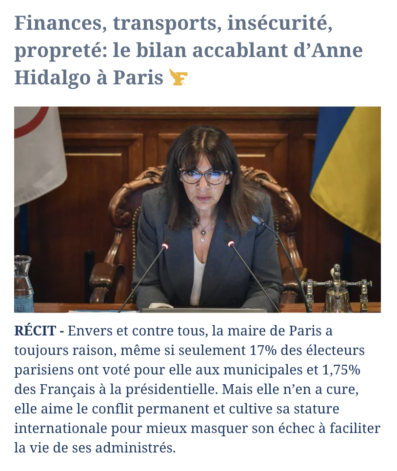即便如此,巴黎市長永遠是對的,哪怕只有17%的巴黎選民在市政選舉中投票支持她,而在總統選舉中僅有1.75%的法國人投票支持她。但她並不在乎,她喜歡永無休止的衝突,並培養自己的國際形象,以更好地掩蓋自己在方便市民生活方面的失敗。