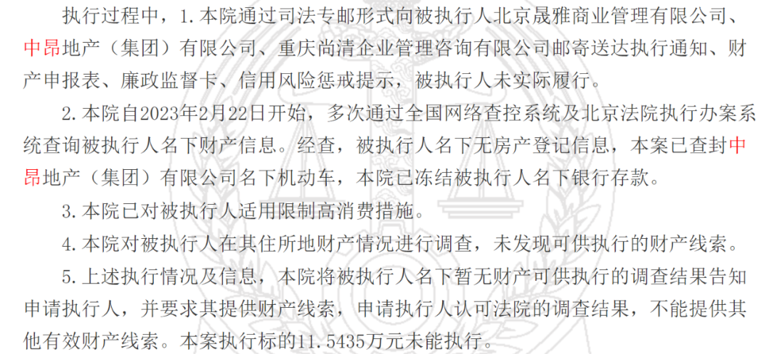 門頭溝區人民法院在執行裁定書中稱,執行過程中,通過司法專郵形式向被執行人北京晟雅商業管理有限公司、中昂地產(集團)有限公司、重慶尚清企業管理諮詢有限公司郵寄送達執行通知、財產申報表、廉政監督卡、信用風險懲戒提示,被執行人未實際履行。