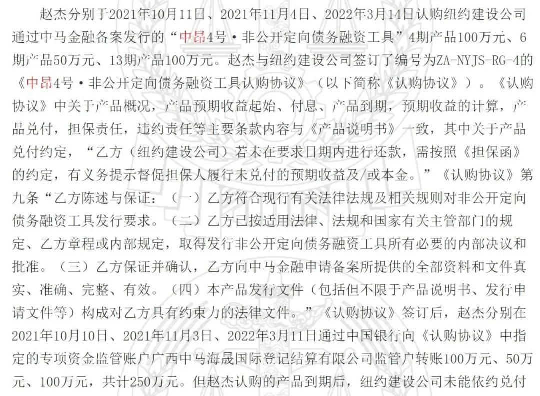 購買中昂系債權路徑基本類似,除了匯銓佳得拍賣平台外,還有投資人通過廣西中馬新城國際金融服務中心,購買中昂系公司紐約建設公司所發行的“中昂4號·非公開定向債務融資工具產品”等。