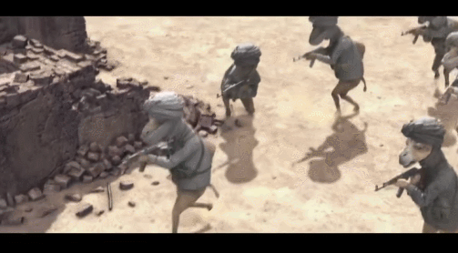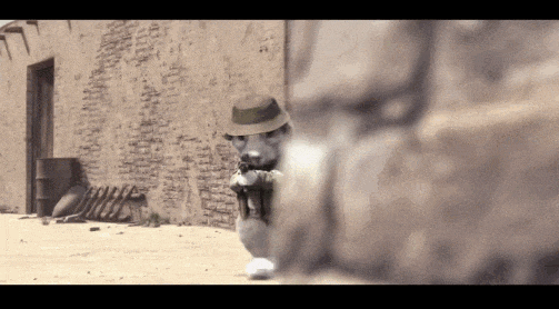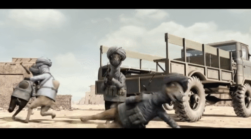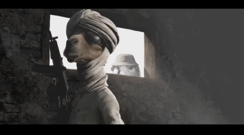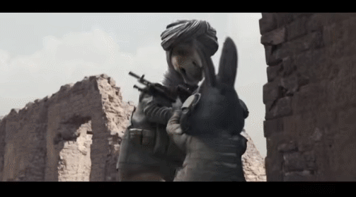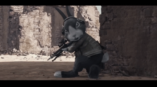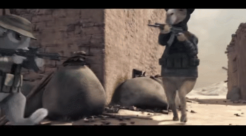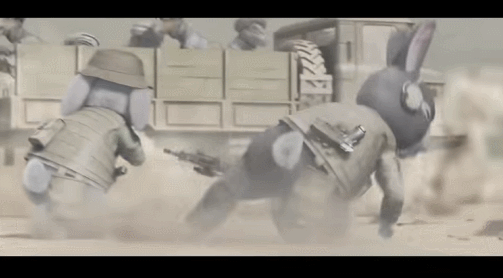 雖然兩隻兔子的配合堪稱完美,但駱駝的援軍就像是源源不斷一樣,又一輛滿載着駱駝的卡車襲來,帕奇和波塔斯基被敵人的優勢火力大的抬不起頭,只能躲在幾堵牆後無法還手。當然,這麼薄的牆肯定無法擋住AK在近距離的直接射擊,這樣的場景只是藝術加工罷了。