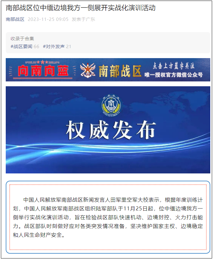 11月25日,微信公眾號“南部戰區”發佈信息,中國人民解放軍南部戰區新聞發言人田軍裏空軍大校表示:根據年度訓練計劃,中國人民解放軍南部戰區組織陸軍部隊於11月25日起,位中緬邊境我方一側舉行實戰化演訓活動,旨在檢驗戰區部隊快速機動、邊境封控、火力打擊能力。