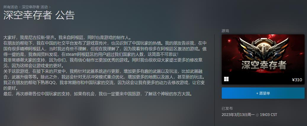 小發最開始以為這只是一個梗,直到一位來自阿根廷的遊戲開發者發佈了一條面向中國玩家的公告。
