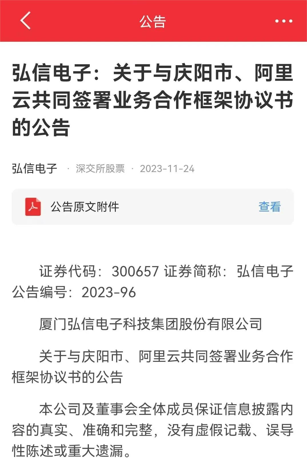 不得不承認,A股上市公司弘信電子(300657)在年初提前佈局算力產業鏈確實有過人的前瞻性。弘信電子在算力產業上的落子之快更令業界感到意外。11月24日,弘信電子在杭州舉辦的“甘肅綠色算力產業推介會”上與甘肅慶陽市、阿里雲三方簽訂業務合作協議後,弘信電子的算力產業鏈雛形已然形成。