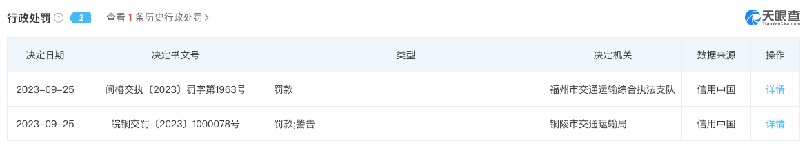 通過天眼查也可以發現,高德打車的主體公司北京易行出行旅遊有限公司,同樣因為經營許可的問題,在2023年9月25日,分別遭到銅陵市、福州市交通部門的處罰。