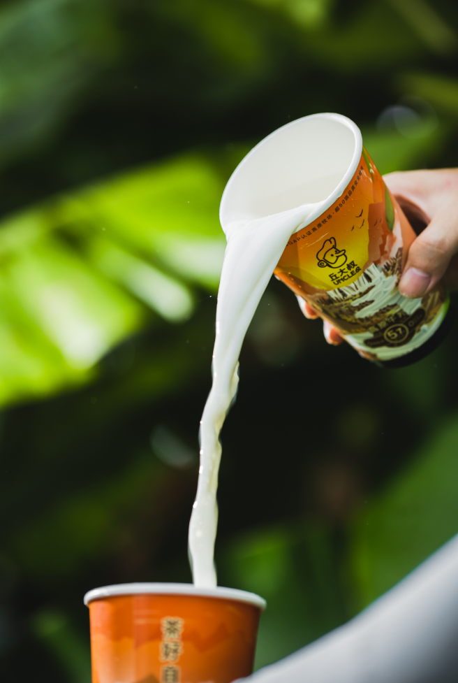 比如雨林可可香奶茶。丘大叔結合健康化趨勢,升級使用的0奶精0植脂末0反式脂肪酸0氫化植物油的高原牛乳,每100mL含5.7g優質乳蛋白(為國際要求1.9倍),及172mg原生高鈣(超國際要求43%),由塞尚乳業獨家供應。