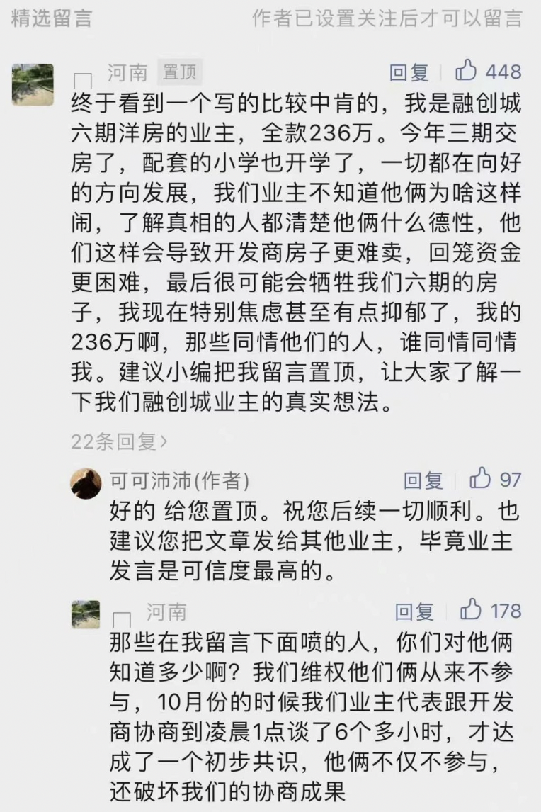 下面是一個業主的回應,**他全款236萬買的融創城6期洋房,雖然爛尾,但今年3期已經保交交房,一切都在向好的方向發展,他們不鬧,不是甘心,而是選擇最符合自己利益的方式:拿到房。**甚至該業主説,所有業主都不懂這兩個年輕人,他們鬧,開發商資金回籠更難,六期的業主更拿不到房,你同情他們兩個,誰來同情同情自己這幫人?