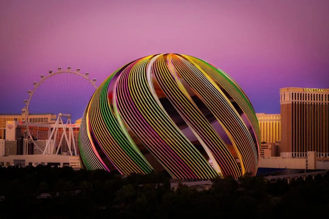 這也使得The Sphere球體館一躍成為拉斯維加斯最貴的娛樂場所。它高 366 英尺、寬516英尺,外殼是世界上最大的LED屏,覆蓋了58萬平方英尺的球體表面,由2億6843萬像素組成,能顯示 2.56 億種不同的顏色,可以將其轉換為不同的物體或場景。