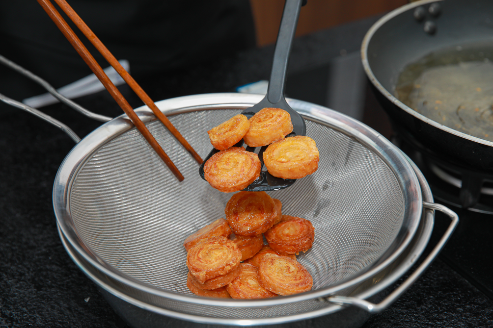 “野雞卷”裏的“野雞”,很有可能包含了不按常規方法烹製的意思。傳統粵菜講究“雞有雞味,魚有魚味”,野雞卷這種用物理方法捆紮捲攏,改變豬肉質地;用先蒸後炸地加熱,改變肥膘肉油膩、裏脊肉瘦嫩,達到口感上某種平衡的方法,確實體現了順德人不按常理出牌,以巧思獲取更幽深滋味的用心。