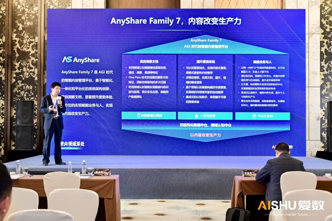 愛數數據智能解決方案總監鄭瀚圍繞企業內容管理,介紹了AGI技術為智能內容管理變革帶來的機遇,利用AnyShare Family 7的內容智能化架構,挖掘非結構化數據價值,釋放內容管理生產力。