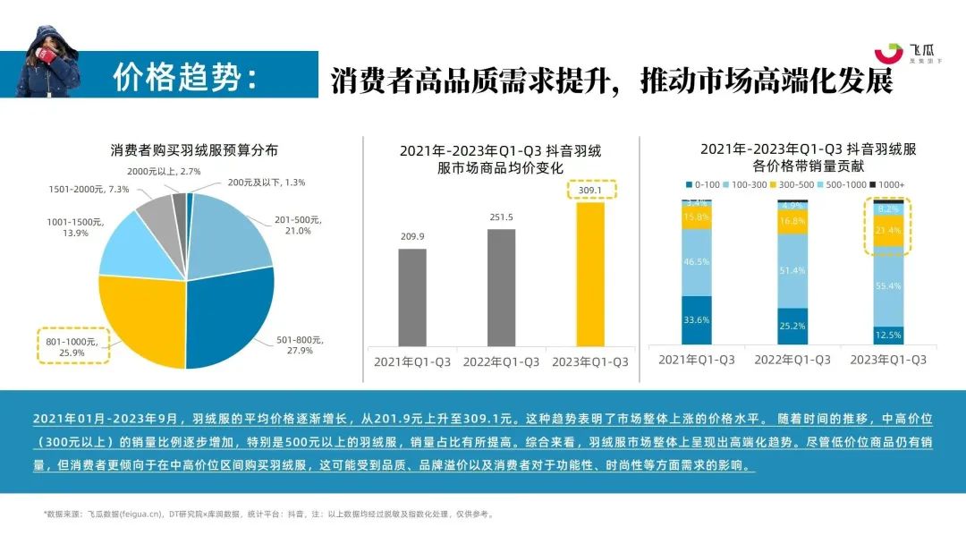 **價格趨勢:**羽絨服社媒電商平均價格從201.9元上升至309.1元,消費者對於羽絨服的預算也處在500元以上,以及消費者高品質需求提升,推動羽絨服市場高端化的發展,綜合來看,羽絨服市場整體上呈現出高端化趨勢。