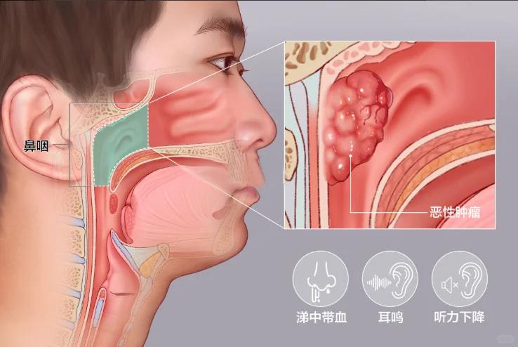 早期鼻咽癌有這些症狀:鼻塞;鼻出血;回涕帶血;頭痛、複視、面麻;頸部淋巴結腫大;耳鳴、聽力減退、耳內閉塞感。這每個症狀但拿出來都很容易以為只是普通感冒、感染、頭痛。正是如此,一般患者初發時很難聯想到鼻咽癌。