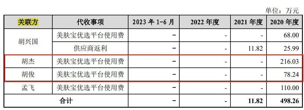 對比之下,胡杰、胡俊既不在環亞科技任職、也不是股東,與環亞科技產生的交易也不算多,是在2020年代收過美膚寶優選平台使用費,分別為216.03萬元、78.24萬元,後如數歸還。