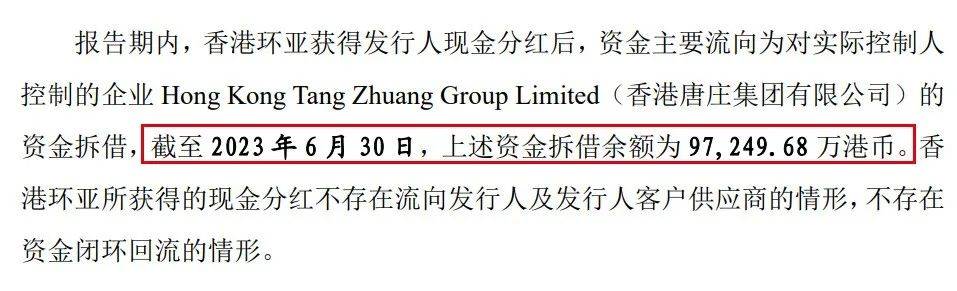 其中,香港環亞對實控人子公司Hong Kong Tang Zhuang Group Limited(香港唐莊集團有限公司)進行資金拆借。截至2023年6月30日,上述資金拆借餘額為9.72億港元。