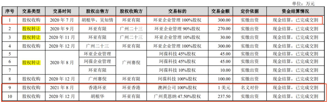 2020年7月,吳知情、胡根華母子將環亞企業管理100%股權轉讓予環亞有限,總對價300萬元,胡根華正是公司法人;2020年12月,胡根華將廣州莫恩納47.5%股權轉讓予環亞有限,對價237.50萬元。