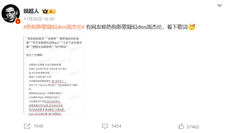 結果仔細一看,起因是説唱歌手熱狗在11月23日發佈了一首新歌《依然我行我素》。
