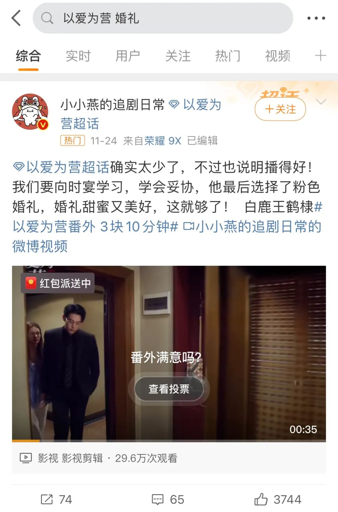 點擊進#以愛為營婚禮#的熱搜話題可以看到,排序靠前的幾乎都是微博大V、營銷號、主演大粉們的博文,真正的自來水少之又少。對常年混跡於微博的用户來説,何為自然而然引發廣泛討論的熱搜話題,何為微博平台及劇集官方炮製的熱搜話題,大多數情況下是不難分辨的,尤其是對《以愛為營》此類全網輿論極度兩極分化的劇集而言。