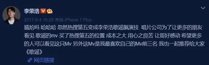 不過,更直觀説明微博熱搜可交易屬性的,還是早年的一則舊聞與今年的一則新聞。歌手李榮浩曾在2017年發過一條微博:尷尬嗎,哈哈哈,忽然熱搜第五變成李榮浩歌謠飆演技,唱片公司為了讓更多的朋友看見歌謠的MV,買了熱搜第五的位置,成本之大,用心之良苦,讓哥好感動。”