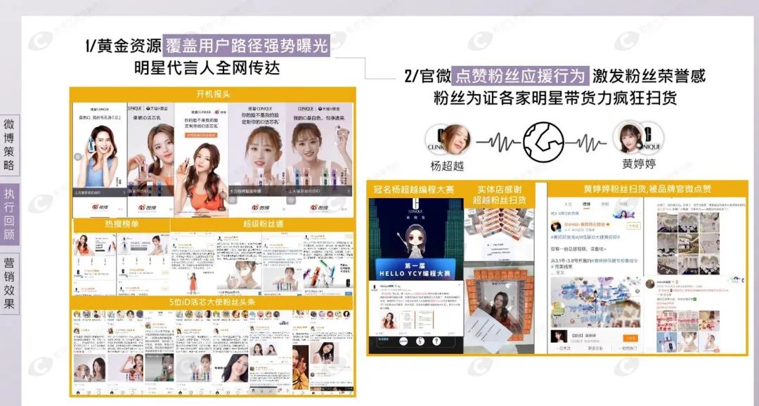 曾經微博推出的明星勢力榜,就是平台飯圈化,甚至加劇飯圈演化的縮影,雖然如今該榜單已經下線,但飯圈生態已然固化。此外,王一博代言Redmi後,品牌、明星、微博三方的一次合作報告中提到“熱搜話題引導粉絲實時熱議”,楊超越成為倩碧大使後,同樣的合作報告中提及“官微點贊粉絲應援行為,激發粉絲榮譽感”,從中都可以看出微博對飯圈的“花式操控”。