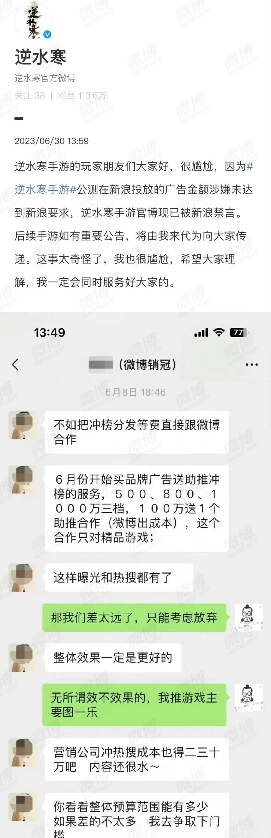 今年六月份,《逆水寒》手遊公測時遊戲官微被禁言,隨後官微發文稱原因為“在新浪投放的廣告金額涉嫌未達到新浪要求”。從官微附上的圖片來看,遊戲方人員與備註為“微博銷冠”的人員聊天時,後者提出“6月份開始買品牌廣告送助推衝榜的服務,500萬、800萬、1000萬三檔”、“營銷公司衝熱搜成本也得二三十萬”。