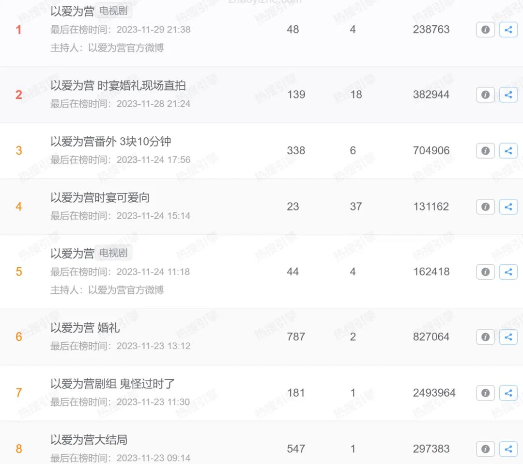 從熱搜引擎的數據來看,豆瓣評分4.4分的《以愛為營》,劇名相關熱搜詞條達到60個,如果加上男主時宴和女主鄭書意的單人熱搜詞條,數量已然近百。也就是説,開播至今劇集平均每日便有三條左右熱搜。看似魔幻,但也屢見不鮮,畢竟此前還有劇集開播半月登上了200多條熱搜。