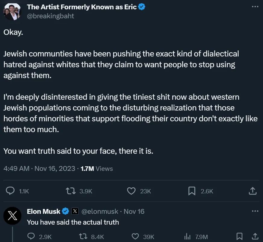 一名X用户發佈了一段推文,指出“西方猶太社區對白人有一種辯證的仇恨,但他們卻不允許別人對他們保有相同的敵意”等針對猶太社區的批評。在巴以戰事還在持續的當下,這個説法與當前西方主流輿論方向相悖,毫無疑問是會被劃為反猶太主義的一段話。