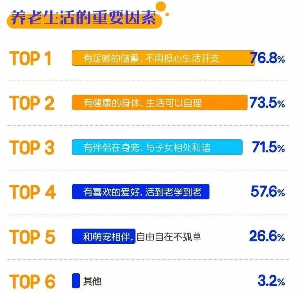 《洞察報告》中指出,人們對於美好養老生活的理解豐富多元,不過“擁有足夠儲蓄,不用擔心生活開支”依然是最大的共識——76.8%的調查對象都選擇了這一要素。
