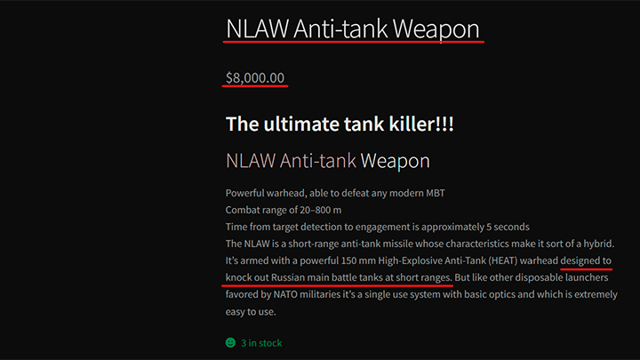 而在暗網上其他一些出售反坦克武器、步兵輕武器的頁面上,“商品描述”中竟直接有“專為在短距離摧毀俄羅斯主戰坦克設計”“主要客户包括烏克蘭”這樣的語句,可以説是直言不諱了……