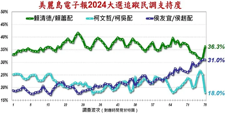 Ⅲ.台灣地區領導人選舉迴歸藍綠對決,國民黨因基本盤迴歸支持率回升至30%以上,賴清德最近兩三天吸收了部分柯文哲支持者,支持率也出現反彈,呈現小幅領先態勢;