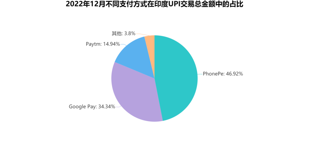 印度國家支付公司的數據顯示,去年12月,PhonePe佔當月UPI交易總金額的46.92%,排名第一;Google Pay佔比為34.34%,排名第二;Paytm排名第三,佔比為14.94%。