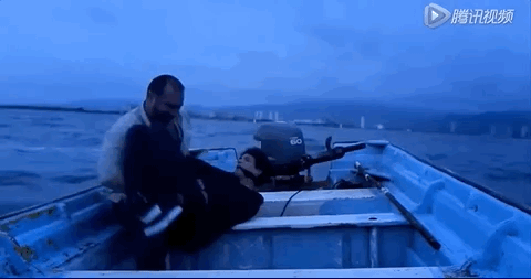 老金划着救生筏,載着被捆住手腳的李苗苗。