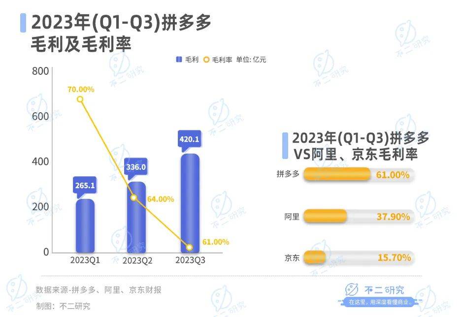 在毛利方面,財報數據顯示2023年Q1—Q3拼多多毛利分別為265.1億、336.0億和420.1億元,大體在波動中延續上漲趨勢。