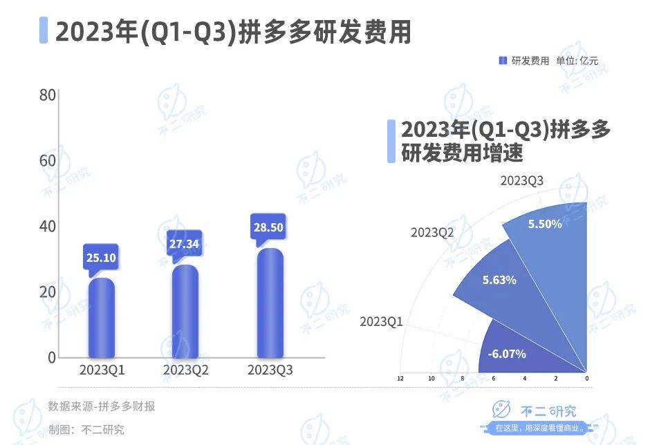 據財報顯示,今年Q1—Q3,拼多多的研發費用分別為25.10億、27.34億和28.50億元,同比分別增長-6.07%、5.63%、5.50%,主要用於科技投入,以及農業科技、供應鏈科技和整體的核心研發。