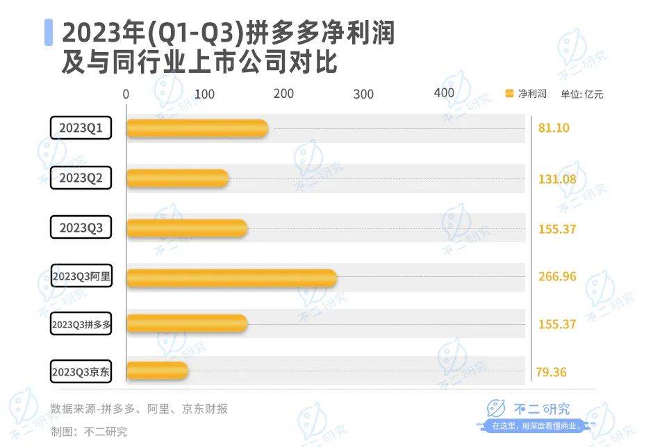 繼2021年Q2首次實現盈利後,今年Q3拼多多仍保持盈利狀態。根據財報數據,2023年Q1—Q3淨利潤分別為81.10億、131.08億和155.37億元,其中第三季度淨利潤為155.37億元,去年同期淨利潤105.88億元。
