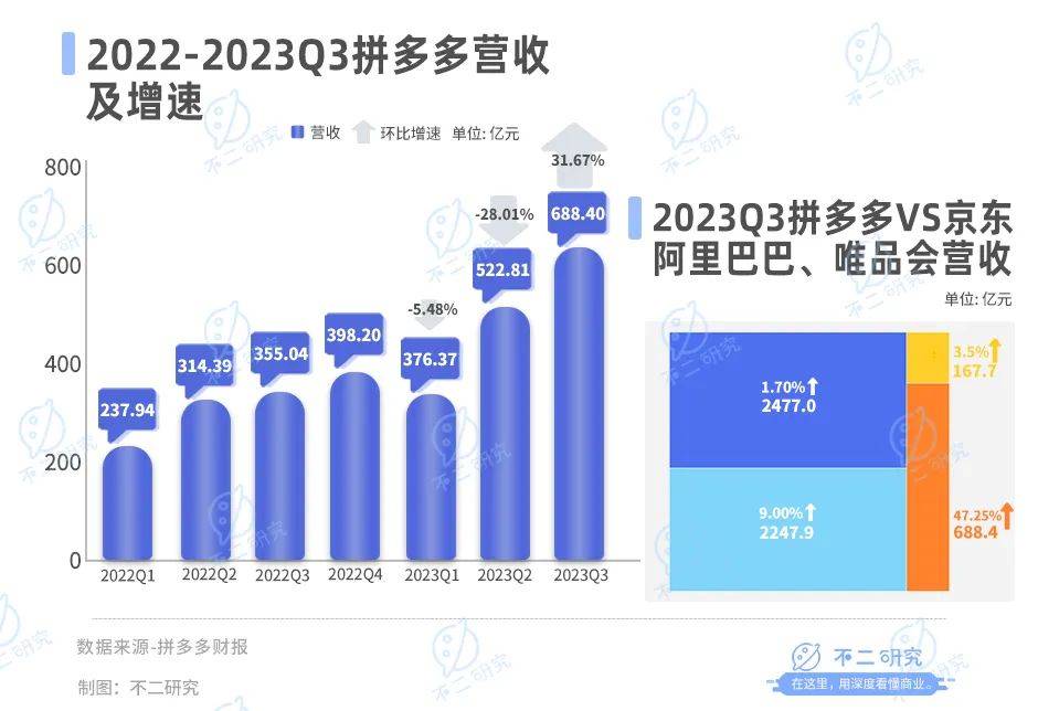 據拼多多2023三季度顯示:2023年Q3,其總營收688.404億元,較去年同期的355億元增長93.9%;同期,歸母淨利潤155.37億元,同比增長47%,遠超市場預期。