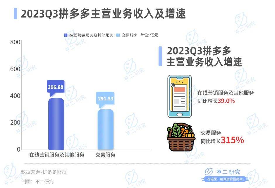 Q3財報顯示,2023年Q3,拼多多在線營銷服務及其他服務的營業收入396.88億元,同比增長39.0%,主要來自商家的廣告收入;交易服務為291.53億元,同比增長315%,主要來自於包括多多買菜佣金收入、Temu收入以及部分百億補貼的佣金收入,其中Temu的營收貢獻是關鍵增長點。