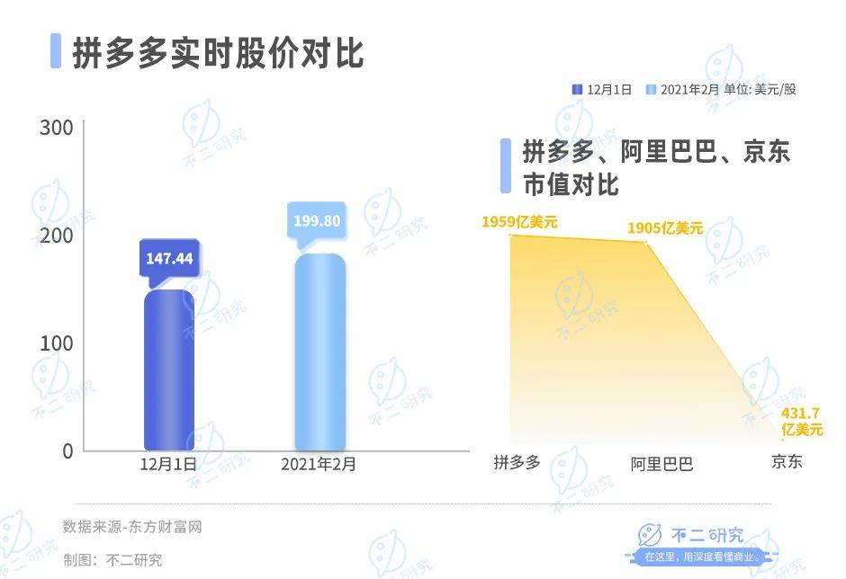 財報公佈次日,拼多多美股開盤即漲超18%,當日(11月29日)報收139美元/股。截至12月1日美股收盤,拼多多報收147.44美元/股,對應總市值1959億美元(約摺合人民幣1398億元);對比2021年2月的市值高點2450.20億美元,其市值已經蒸發491.2億美元。