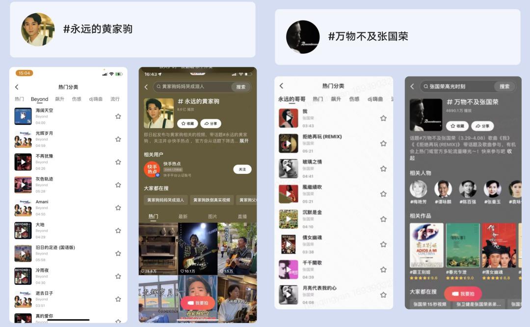 例如,此前快手音樂就曾打造#萬物不及張國榮 和#永遠的黃家駒 活動,在關鍵的時間節點,引導平台用户帶相關話題發佈優質視頻向這兩位國民度頗高的音樂人致敬,與平台的音樂用户產生同頻共振的強烈共鳴,引發全民的情懷,讓經典音樂的曝光達到了千萬級別。