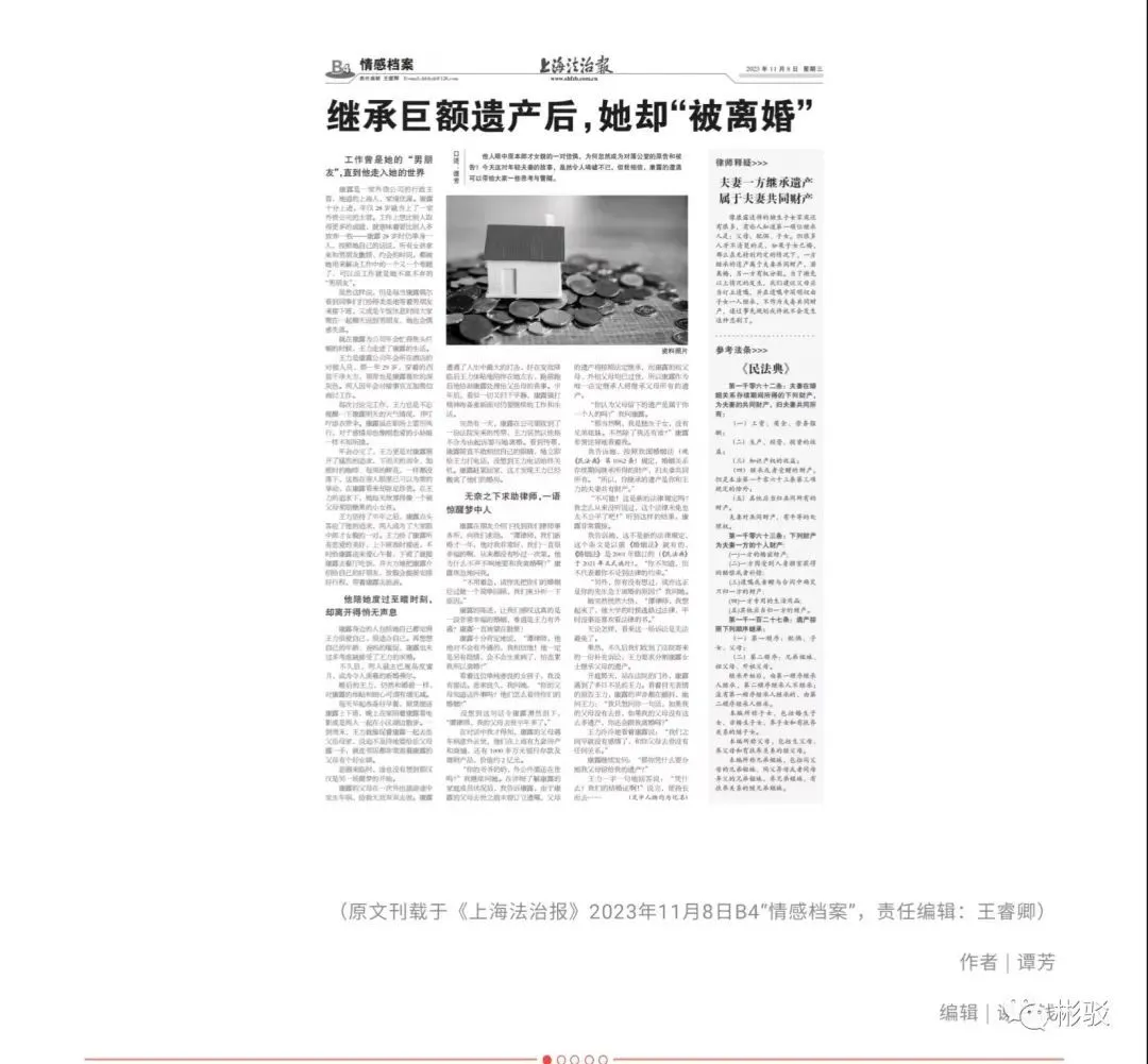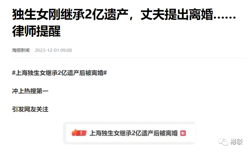 彬駁2023年12月01日 12:29:180人蔘與0評論話題詞#上海獨生女繼承2億遺產後被離婚#衝上熱搜第一的位置,一個狗血滿滿的“新聞”。