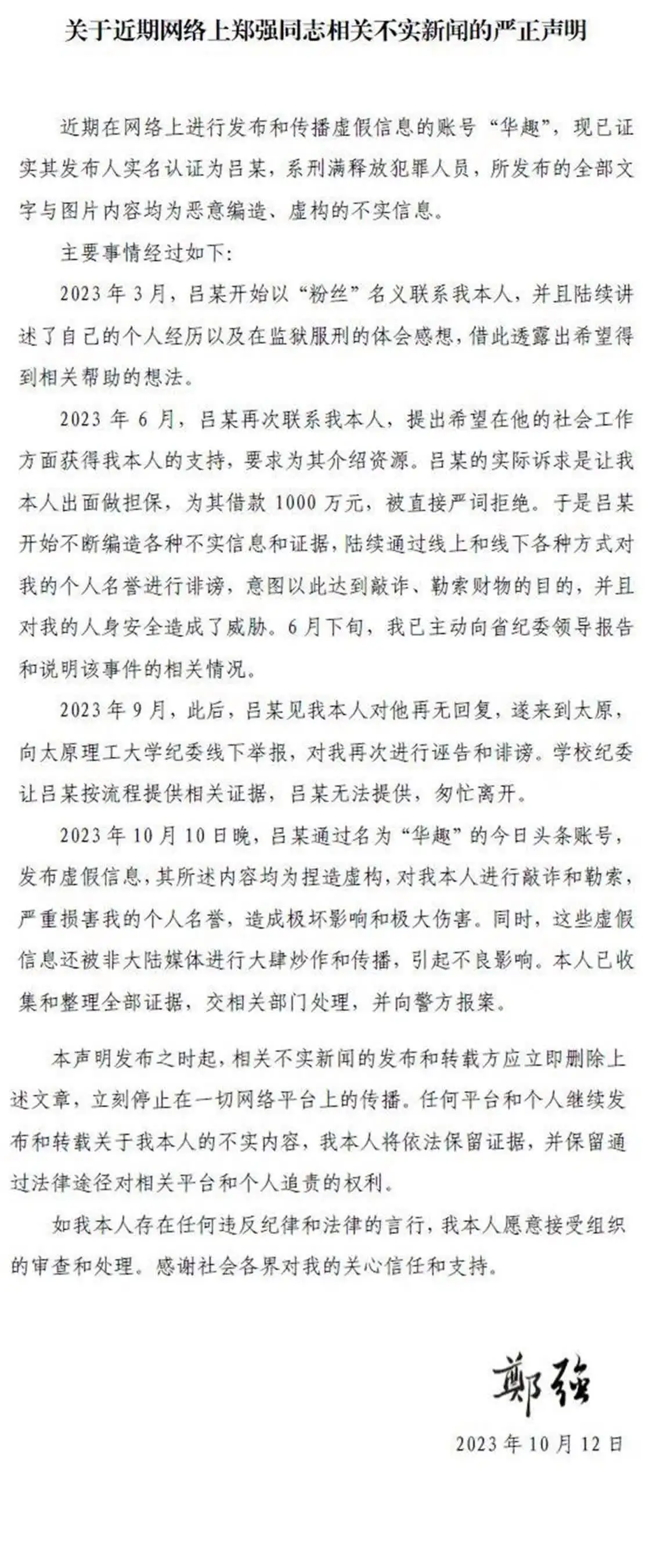 鄭強發佈的闢謠聲明 (來源:鄭強個人公眾號)