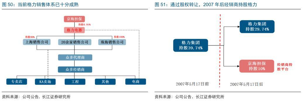 自此,董明珠開啓了格力的第三次渠道改革。2007年,格力大股東拿出10%的股份,讓十大省份的經銷商入股,同時引入中小經銷商,平衡區域性銷售公司的矛盾,形成了一套交叉持股、共同進退的渠道聯盟。