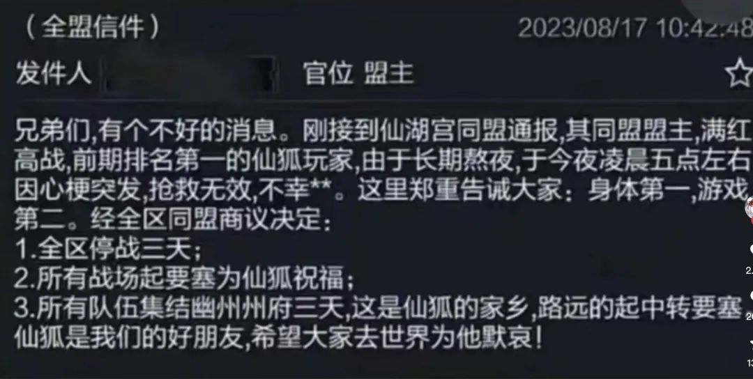 8月的一天,不少《率土之濱》玩家在遊戲中收到全盟信件:仙湖宮同盟盟主、玩家“仙狐”突發疾病,不幸猝死。經全區同盟商議決定,全區停戰3天,所有戰場起要塞為仙狐祝福,所有隊伍集結仙狐家鄉幽州州府,為他默哀。