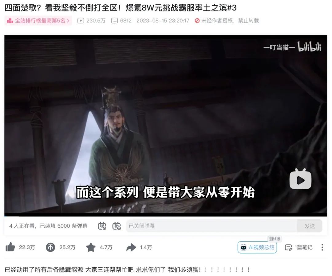 叮噹貓的《率土之濱》遊戲視頻反響不錯,曾登上B站全站排行榜第5位
