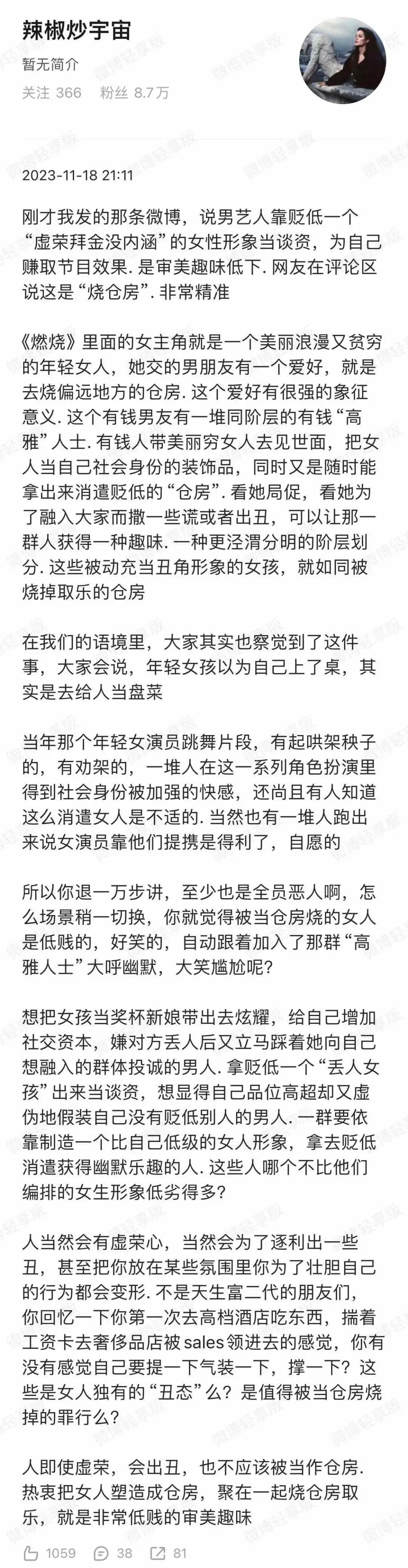 如果是編的,為什麼要編纂一個漂亮沒大腦、最刻板的女性形象當成丑角來供大家調笑呢,而且用詞也很微妙,她是男藝人“新交的女朋友”。